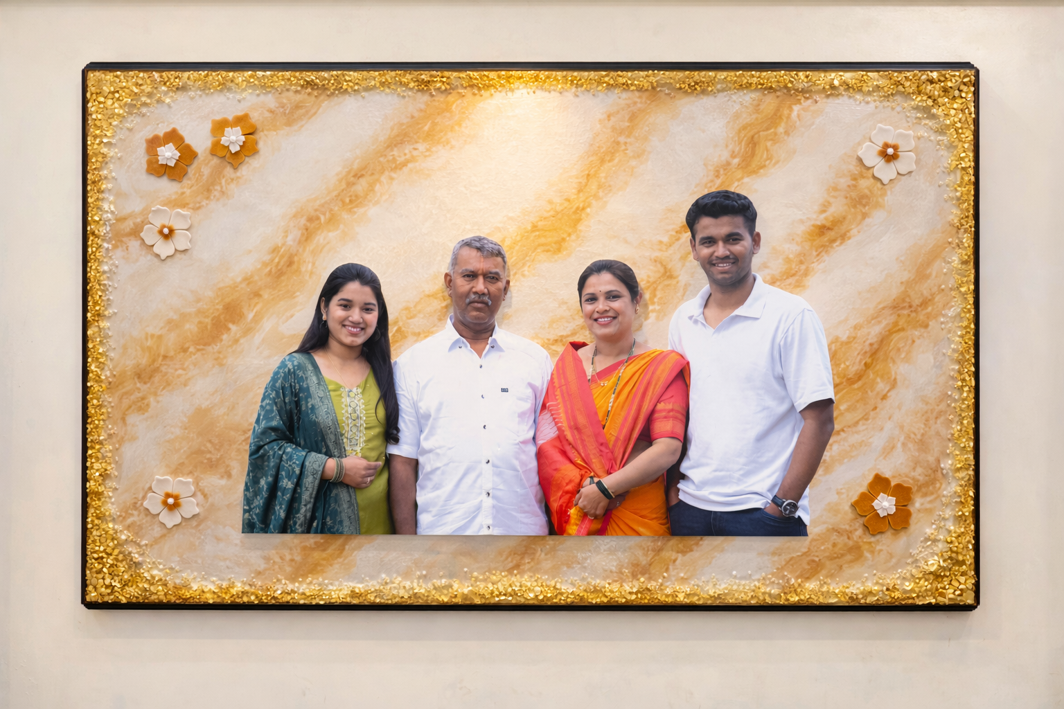 Preserve your precious memories in style with our Customized Resin Wall Frame by Epoxyartwale. Designed with elegant marble-inspired resin textures and finished with luxurious gold crystal borders, this frame transforms your family photo into a stunning wall statement.