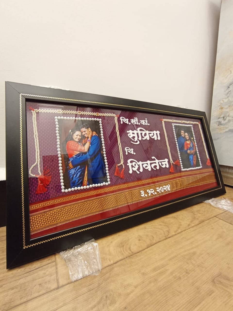 Turn your beautiful wedding moments into a timeless keepsake with our Customized Wedding Memory Pearl Frame by Epoxyartwale. This elegant horizontal frame features dual photo placement, rich traditional fabric background, and hand-finished pearl bead borders that create a royal premium look.