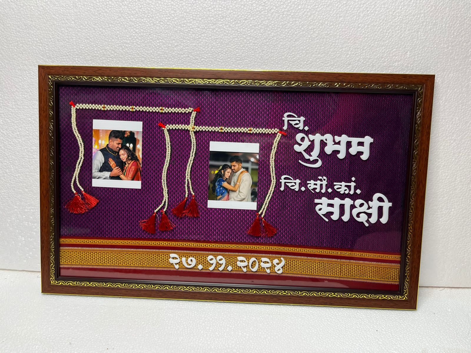 This elegant design features a rich royal purple textured background with bold Marathi name styling, beautifully highlighting the couple’s names and special date. The frame is enhanced with decorative pearl garland elements and red tassel accents, giving it a traditional and festive appearance.