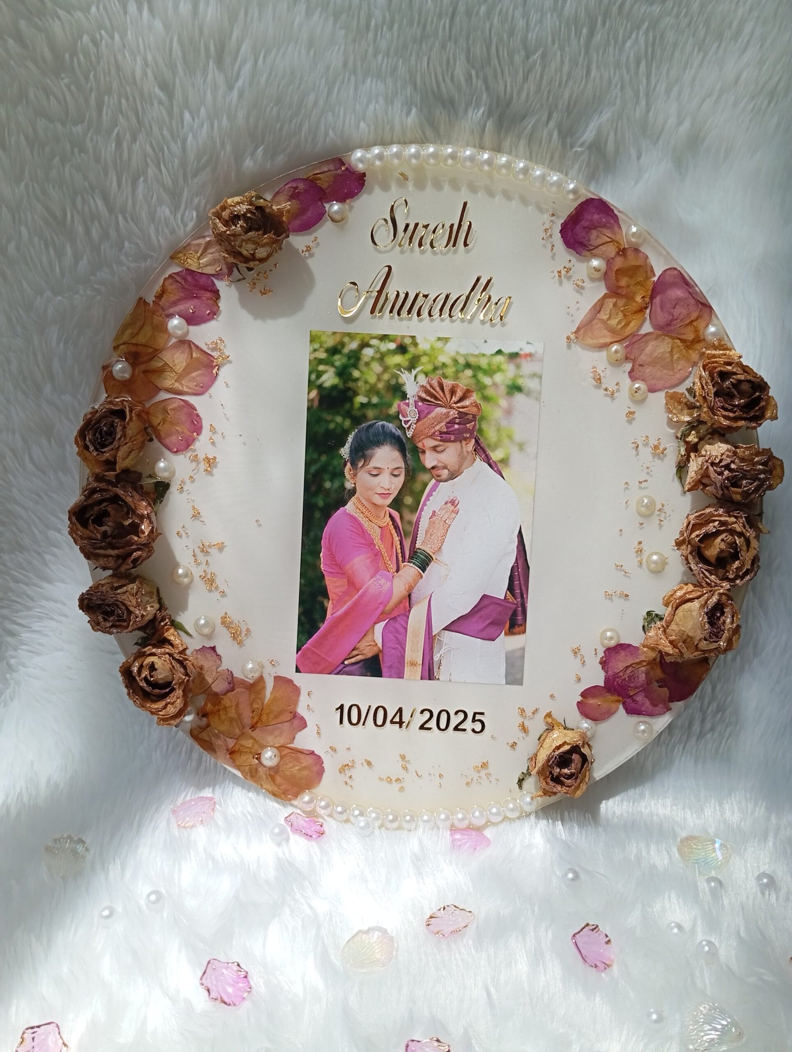 This elegant circular resin frame is beautifully designed with real preserved rose petals arranged gracefully along the border, enhanced with delicate pearl accents and subtle gold flakes for a soft and luxurious finish. The balanced floral detailing on both sides creates a rich and royal look while maintaining a clean and modern aesthetic.