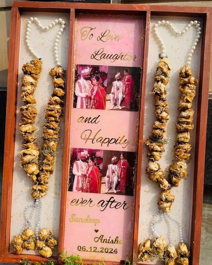 | Material | Premium Wooden Frame, Real Preserved Varmala Flowers, Pearl Bead Accents, High-Quality Printed Photos, Gold Acrylic Name & Date Customization |