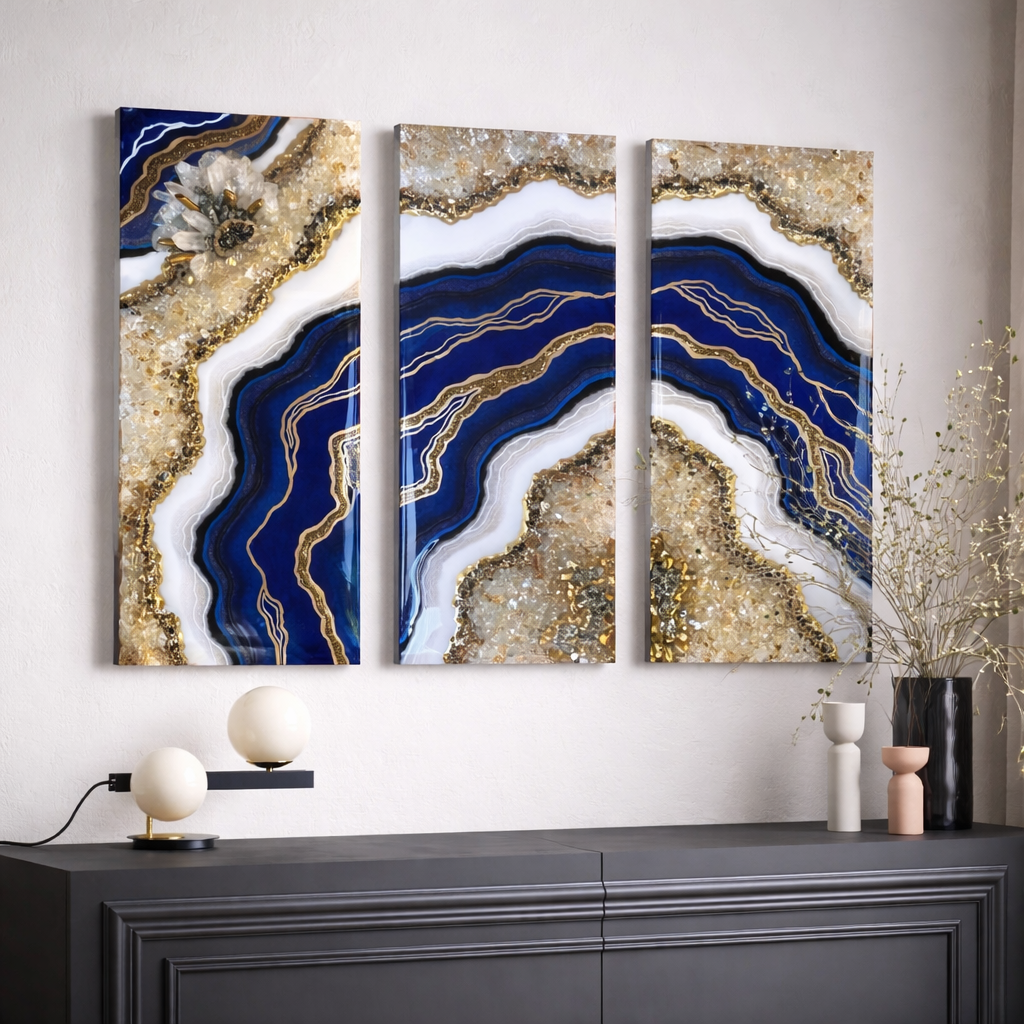 Make a bold statement with this luxurious Royal Blue and Gold Geode Resin Wall Frame set. Inspired by natural crystal formations, this three-panel artwork features deep royal blue waves, white marble textures, and shimmering gold accents that create a rich and high-end look.