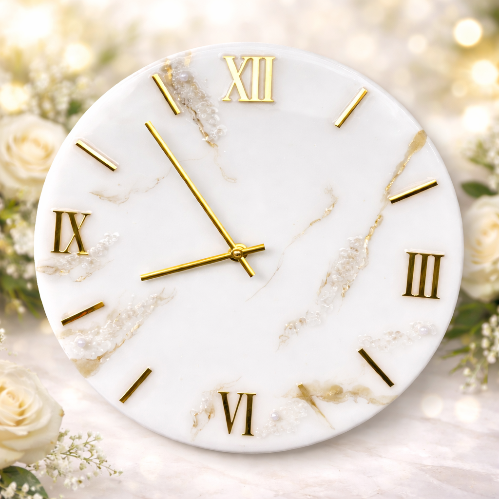 Add timeless elegance to your space with this handcrafted white marble-effect epoxy resin wall clock. Designed with subtle gold veining and crystal stone accents, this clock offers a premium and sophisticated look.